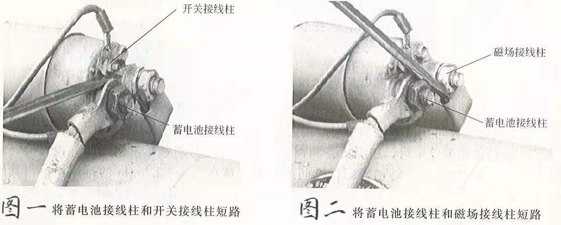 6.用旋具再將蓄電池接線柱和磁場接線柱短路。若啟動機(jī)正常運(yùn)轉(zhuǎn),則說明電磁開關(guān)內(nèi)部有故障,應(yīng)拆下電磁開關(guān),檢查電磁開關(guān)內(nèi)部的活動觸頭和兩個靜觸頭的燒損情況及磁力線圈是否燒損等。如啟動機(jī)仍不運(yùn)轉(zhuǎn),且在短路時無火花出現(xiàn),則說明啟動機(jī)內(nèi)部出現(xiàn)斷路故障;若火花出現(xiàn),則說明啟動機(jī)內(nèi)部出現(xiàn)短路現(xiàn)象,應(yīng)將啟動機(jī)拆下后進(jìn)行修理。