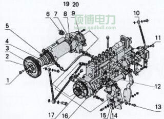 1.噴油泵正時(shí)齒輪緊固螺栓 2噴油泵齒輪墊板 3噴油泵齒輪 4噴油泵傳動(dòng)軸 5傳動(dòng)軸套與齒輪室蓋板聯(lián)接螺栓 6調(diào)整螺套 7噴油泵傳動(dòng)軸套 8油泵聯(lián)接 螺栓  9傳動(dòng)軸套與機(jī)體聯(lián)接螺栓 10增壓補(bǔ)償管 11油門(mén)開(kāi)關(guān)總成 12燃油切斷裝置 13油泵托架螺栓 14油泵托架 15噴油泵油管接頭 16噴油泵連接盤(pán) 17油泵外花鍵