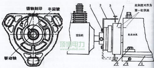 1.YC6105ZLQ機(jī)型,不管用P型泵或VE泵,都是通過(guò)連接板用兩件螺栓直接與空壓機(jī)轉(zhuǎn)動(dòng)軸連接的。先把油泵托架上的油泵緊固螺栓上緊,后再把與空壓機(jī)連接的螺栓緊固即可。注意:此時(shí)必須保證油泵第一缸處于供油時(shí)刻。如圖 2-9-1和圖2-9-3。 油泵與空壓機(jī)轉(zhuǎn)動(dòng)軸(或油泵連接軸)的同軸度一般控制在0.4mm以下。