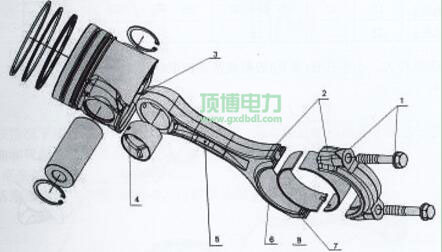 1面(連桿螺栓松動此面光亮)  2  加工編號標記處、3  集油口  4油槽 5連桿安裝方向標記處(向前)  6少數(shù)連桿在7處標加工編號  7大小頭重量(或差)標記處